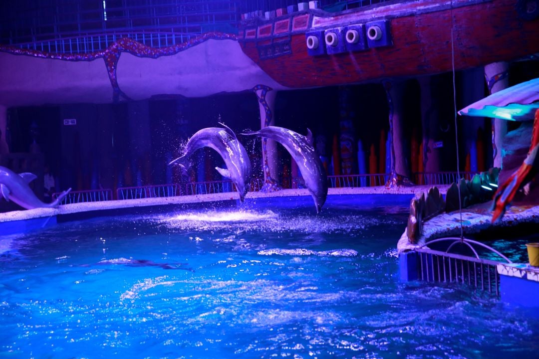 - Les numéros habituels comprenaient notamment des dauphins tirant leurs dresseurs et dresseuses à travers l’eau grâce à leurs nageoires et des dresseurs et dresseuses « surfant » sur leurs dos ou étant propulsés hors de l’eau par le museau du dauphin.